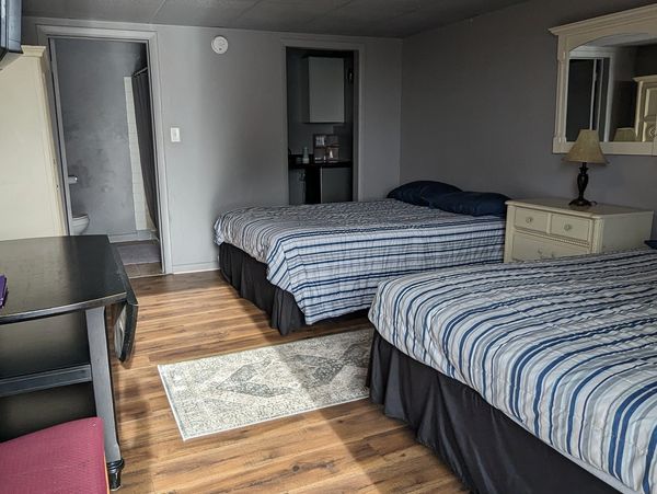 We offer a variety of rooms from single occupancy with a Queen or King bed to double occupancy with 2 Queen beds. We also have a double suite with King and Queen(couch foldout) that has a full kitchen. All rooms have a refrigerator, microwave and complimentary coffee/tea.